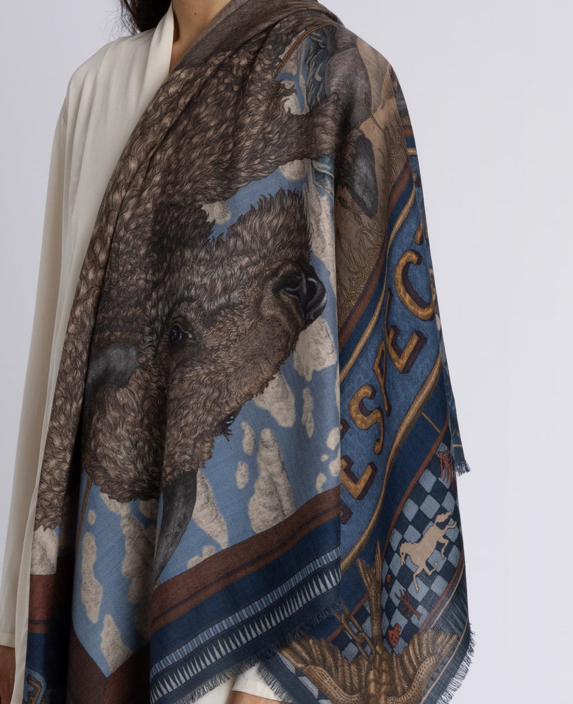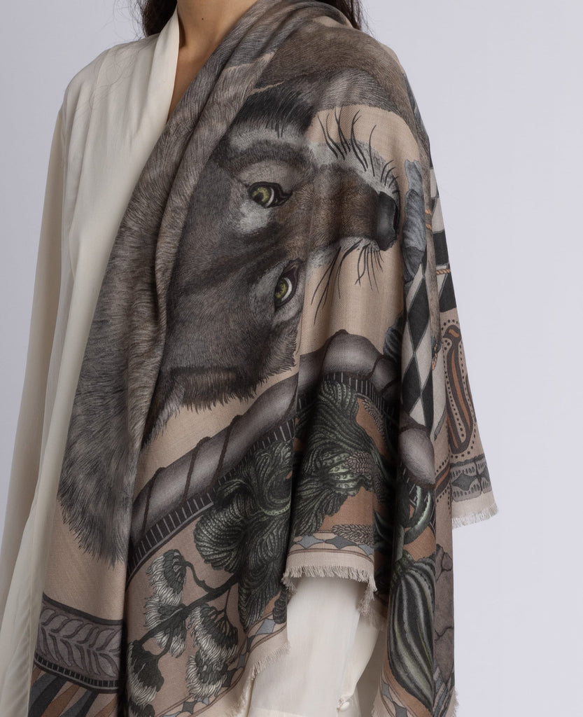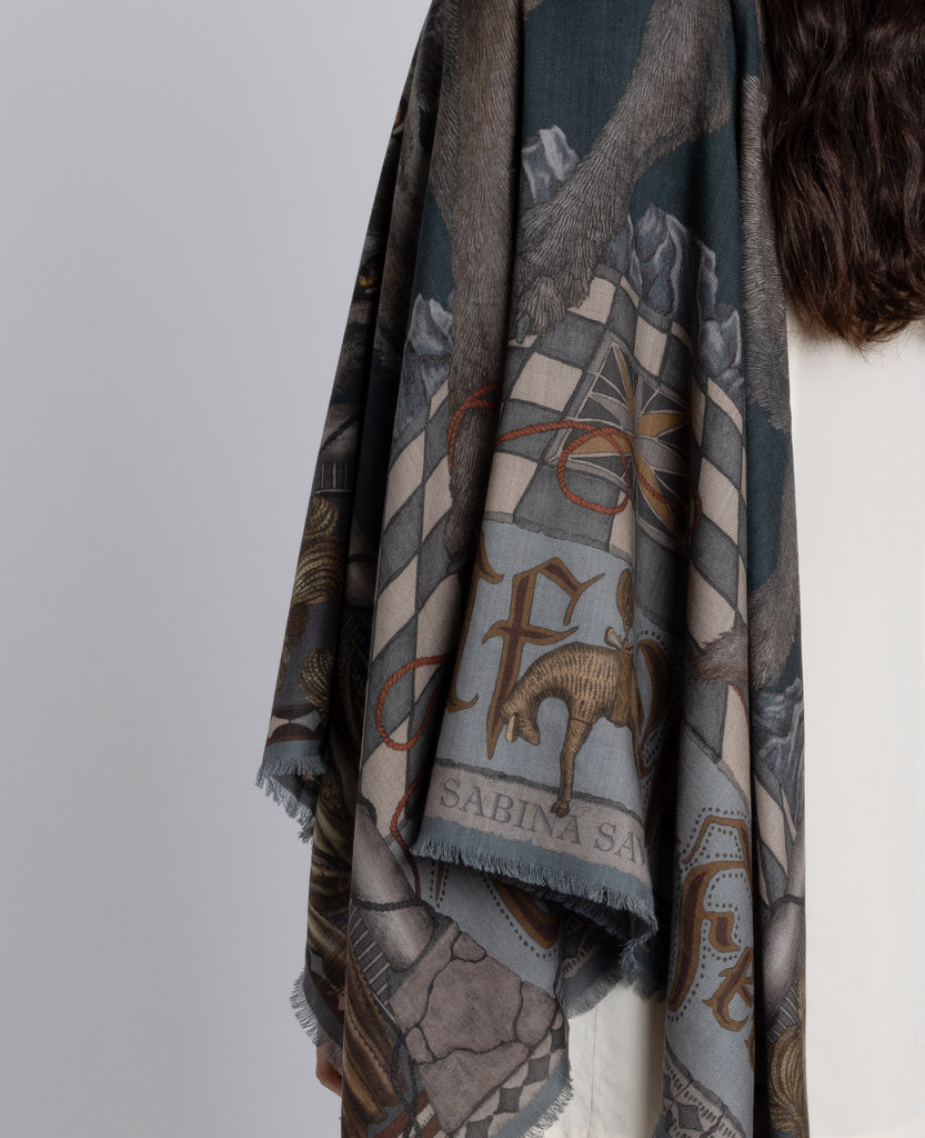 Cool, icy undertones anchor the dusky blue base, accented with chartreuse and copper highlights in the cactus details. The wolf fur adds texture and depth.
