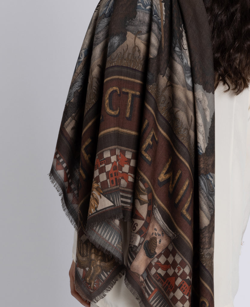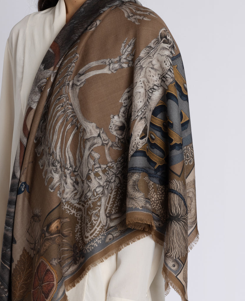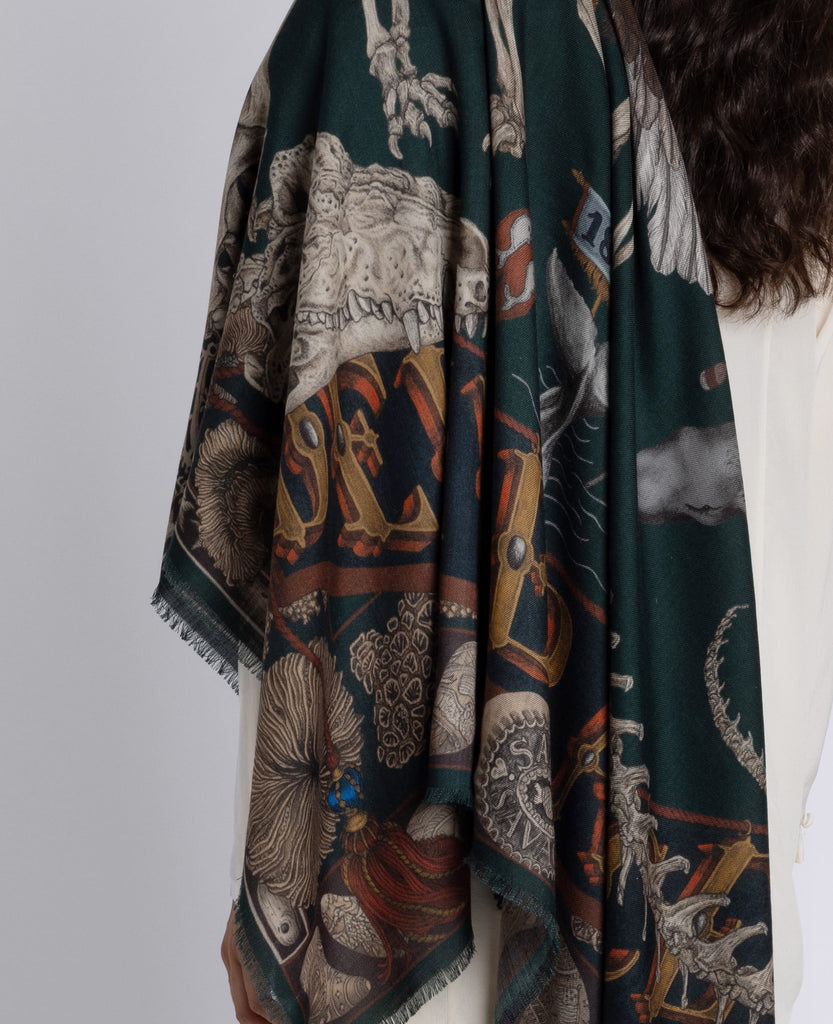 The deep green ground of this design is punctuated with rich jewel-toned details. The bone-coloured accents add highlights to the inky base palette.
