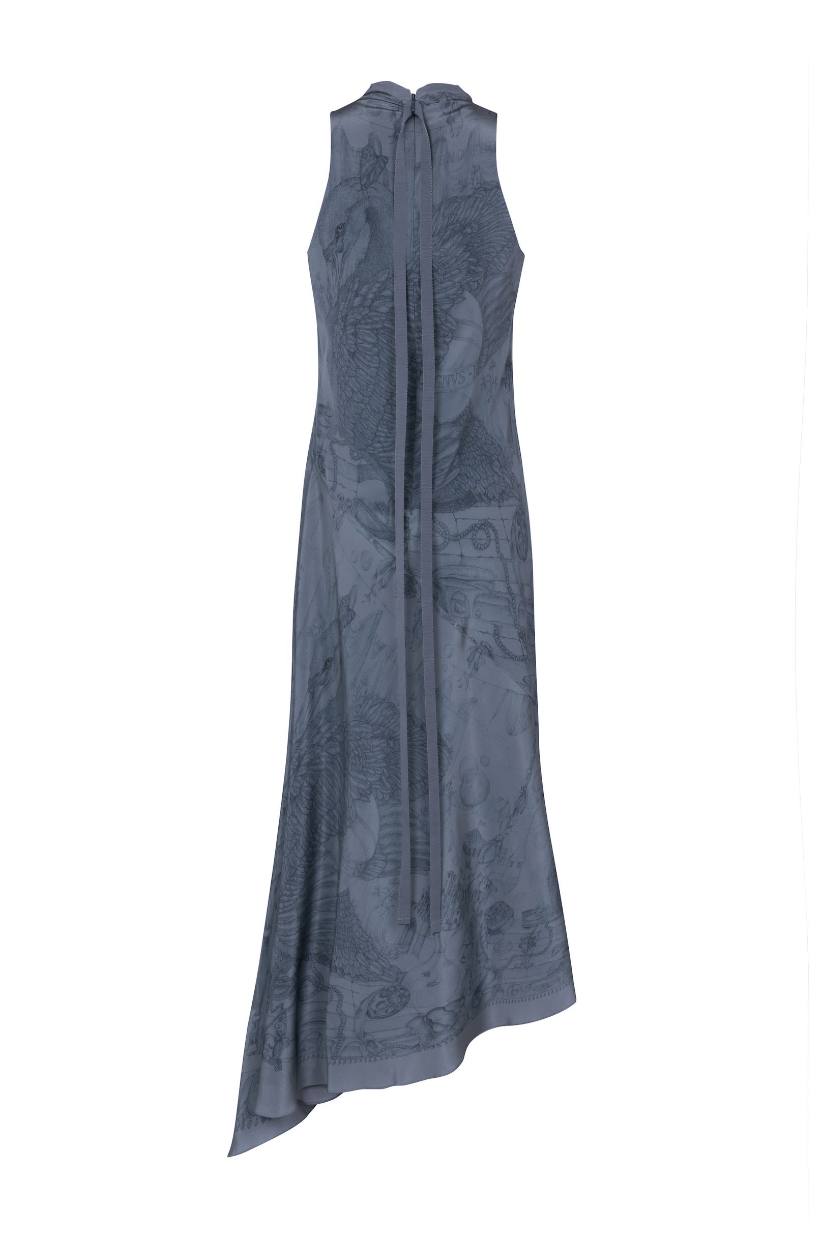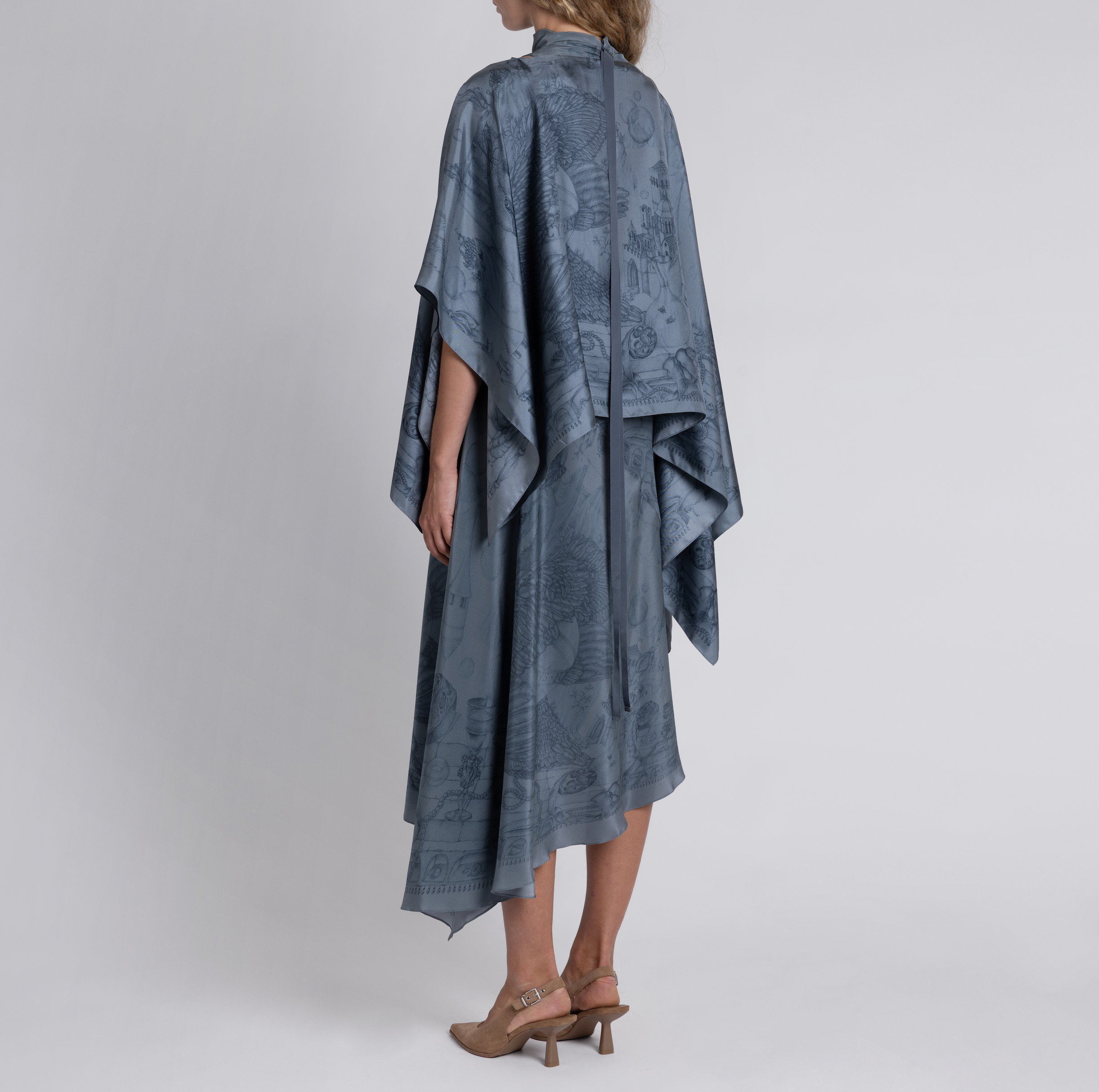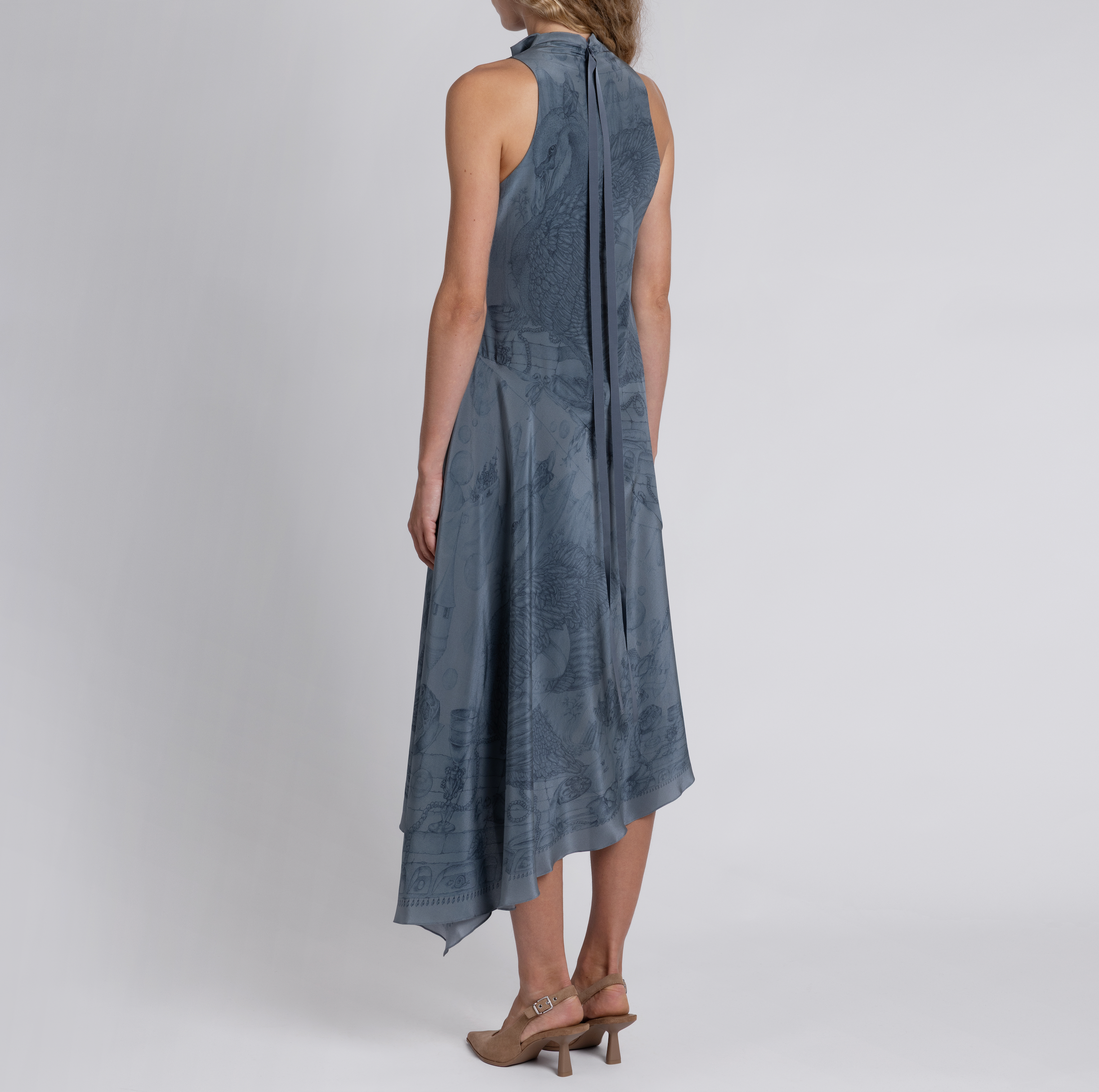 The Silk Waterfall Dress is constructed in London from our dusky Crepe-de-Chine. Showcasing Sabina’s detailed pencil illustration, it features a beautiful asymmetrical bias cut for maximum fluidity. The gentle cowl neckline creates delicate drama, while the armholes are elegantly cut inwards to expose the full shoulder. The dress features a sweeping diagonal seam from the right hip, creating a soft cascade of silk, the precise pin hem ending in a subtle point. The dress fastens with a concealed zip at the centre back, and the garment is finished with French seams, and long grosgrain ribbons trailing gracefully from the back neckline.
