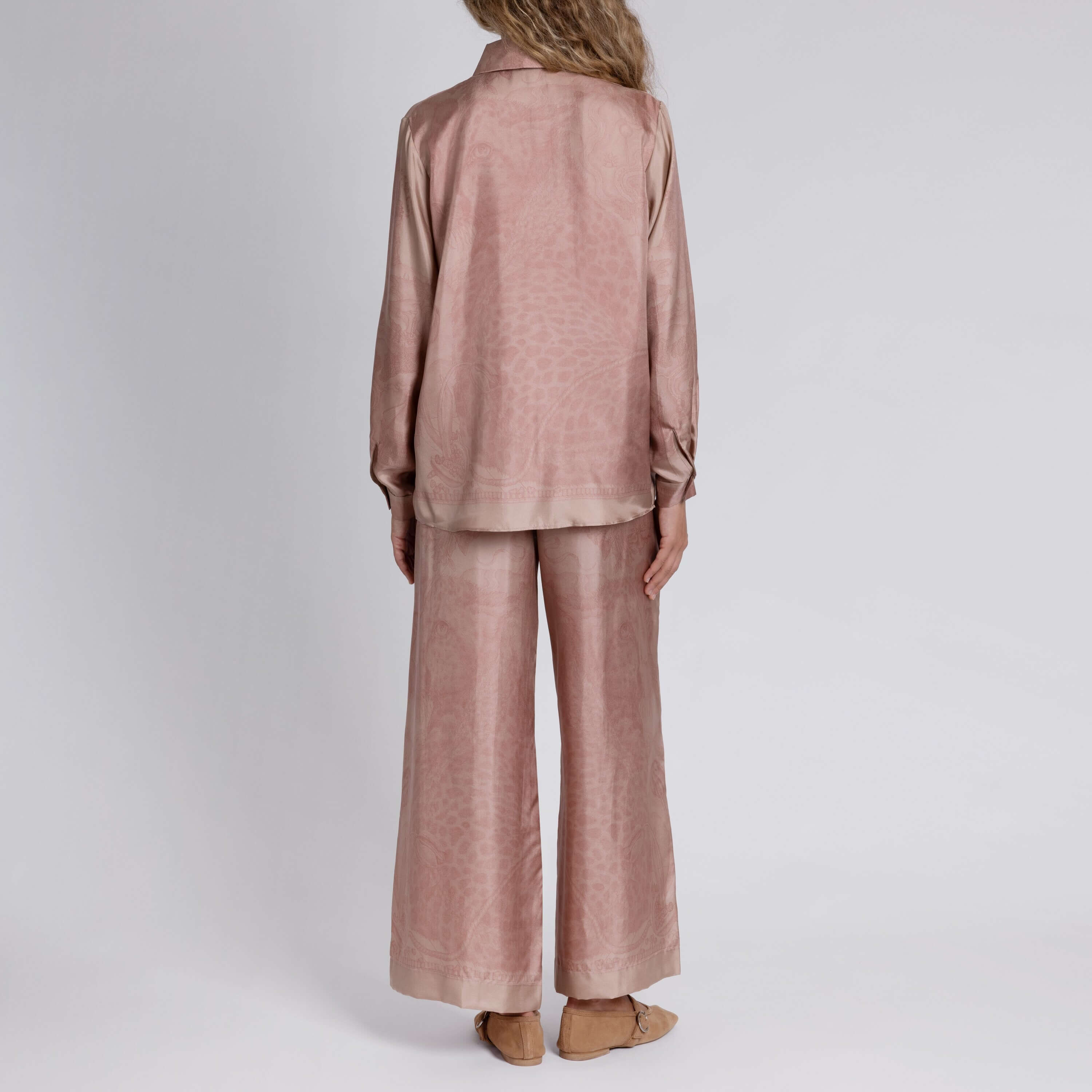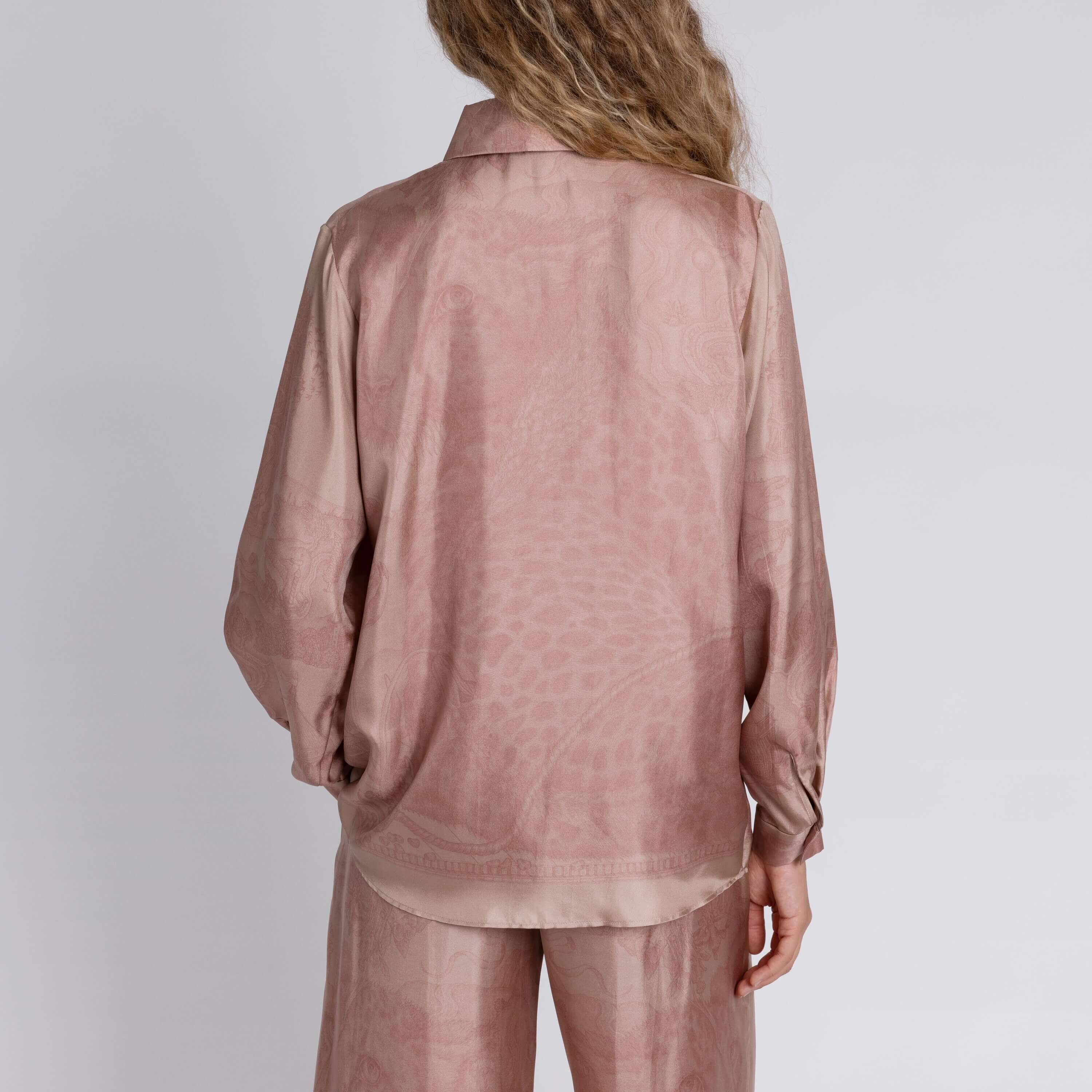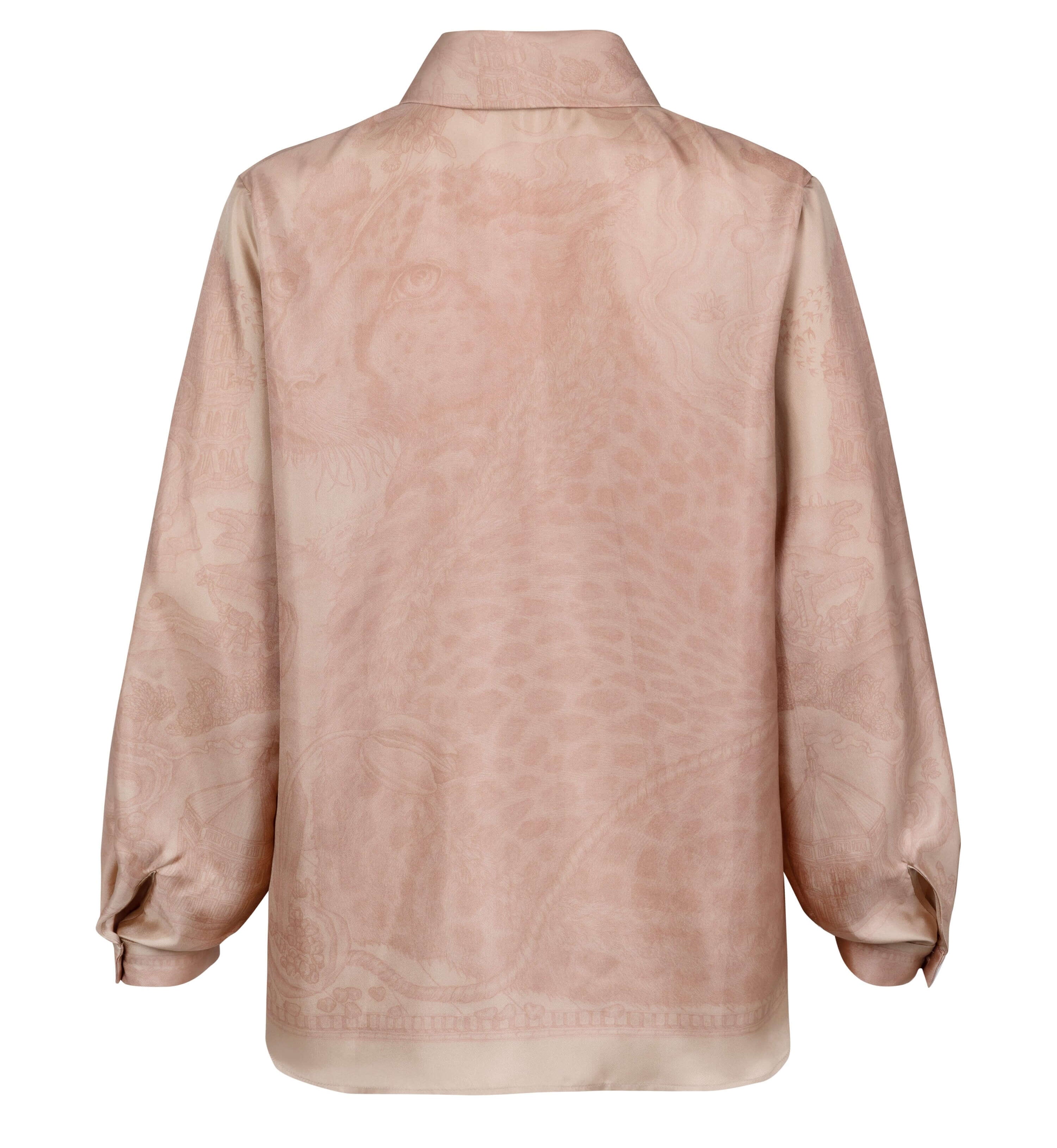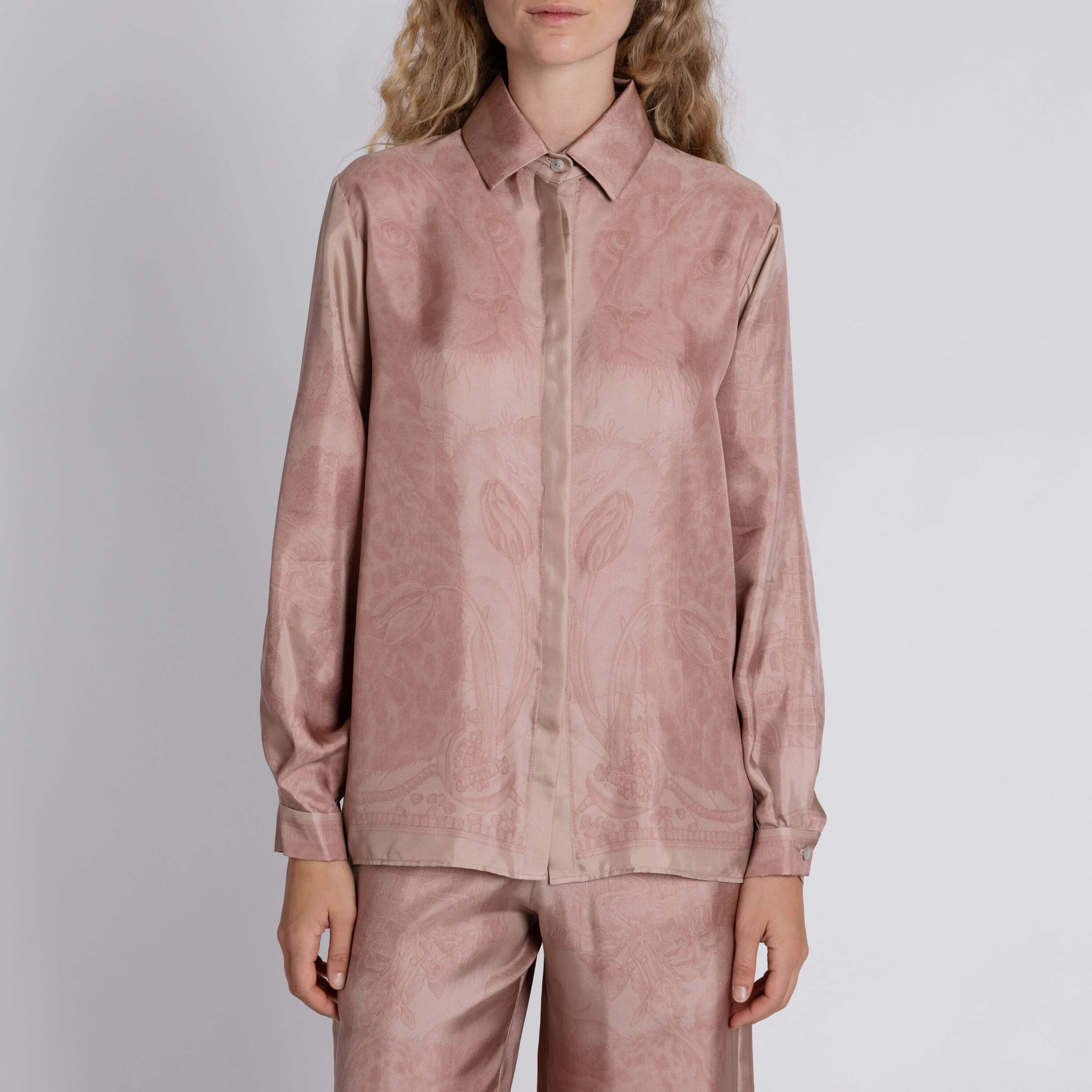 This Silk Oxford Shirt is made in London from our elegant silk twill. It has a traditional shirt collar and a loose-fitting body, and fastens with delicate mother-of-pearl buttons concealed under a simple front placket. We have added volume in the sleeves, draping to a fitted cuff. The garment is French seamed throughout.