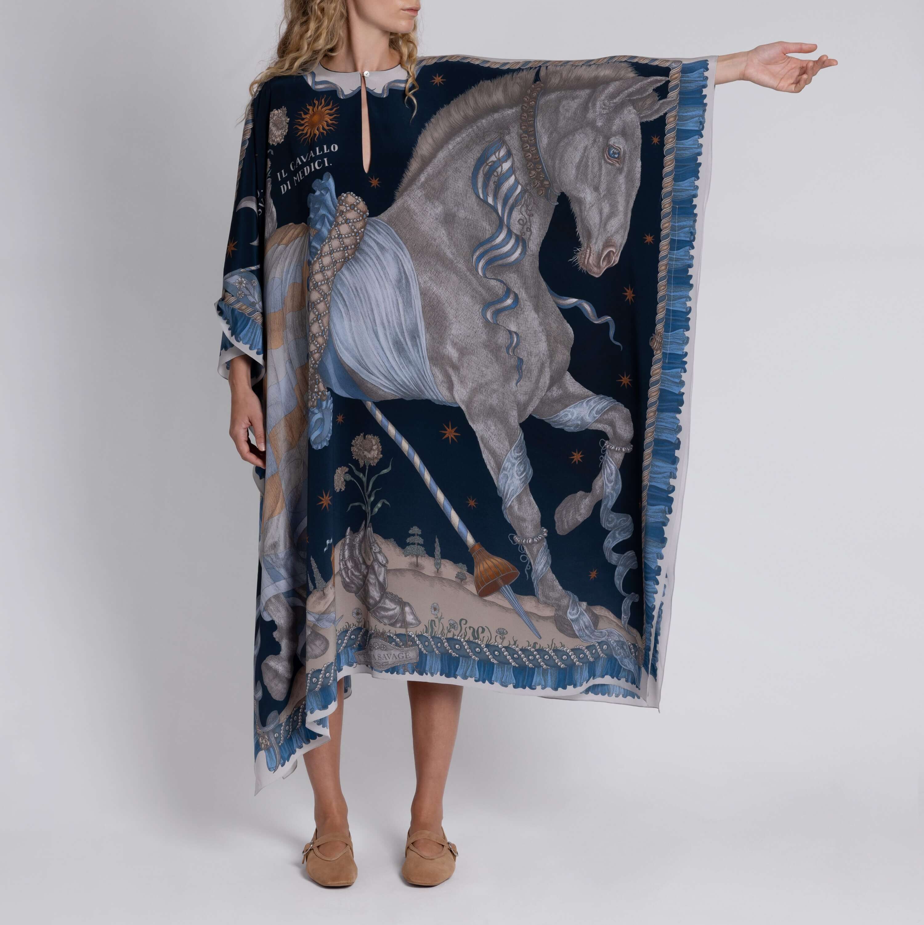 The Celestial Steed was inspired by Italian Renaissance paintings and cultural events alongside beliefs and attitudes of the era; the dichotomy of idealism versus naturalism opening a portal to landscapes of fantasy, a ‘New World’. Inspired by Orso, the unrecognised equestrian star of the famous jousting tournament held by Lorenzo di Medici in 1469, the stark, strong motif of this design was largely influenced by the disarming boldness and architectural simplicity of Antonio Pisanello’s studies of horse heads in his famed Codex Vallardi, alongside equestrian works by Dürer, and various frescoes and masterpieces of the Renaissance era. The armorial elements, such as the sabaton shoe atop the steed’s back, the gauntlet below, and the candy-striped jousting pole all reference historical examples from the Renaissance, while the horse’s striped and embellished carnival attire was inspired by a German illustrated tournament book of the era. The inclusion of sheer fabric is an allusion to Renaissance artwork and symbolism, a juxtaposition of strength and delicacy. Similarly, the metallic armorial elements are holding dainty, fragile flowers; carnations symbolising devotion and divine love, daisies mirroring solar movements throughout day and night; the setting of the sun is inevitably followed by its rising, and there can be no more powerful symbol of hope and resurrection.