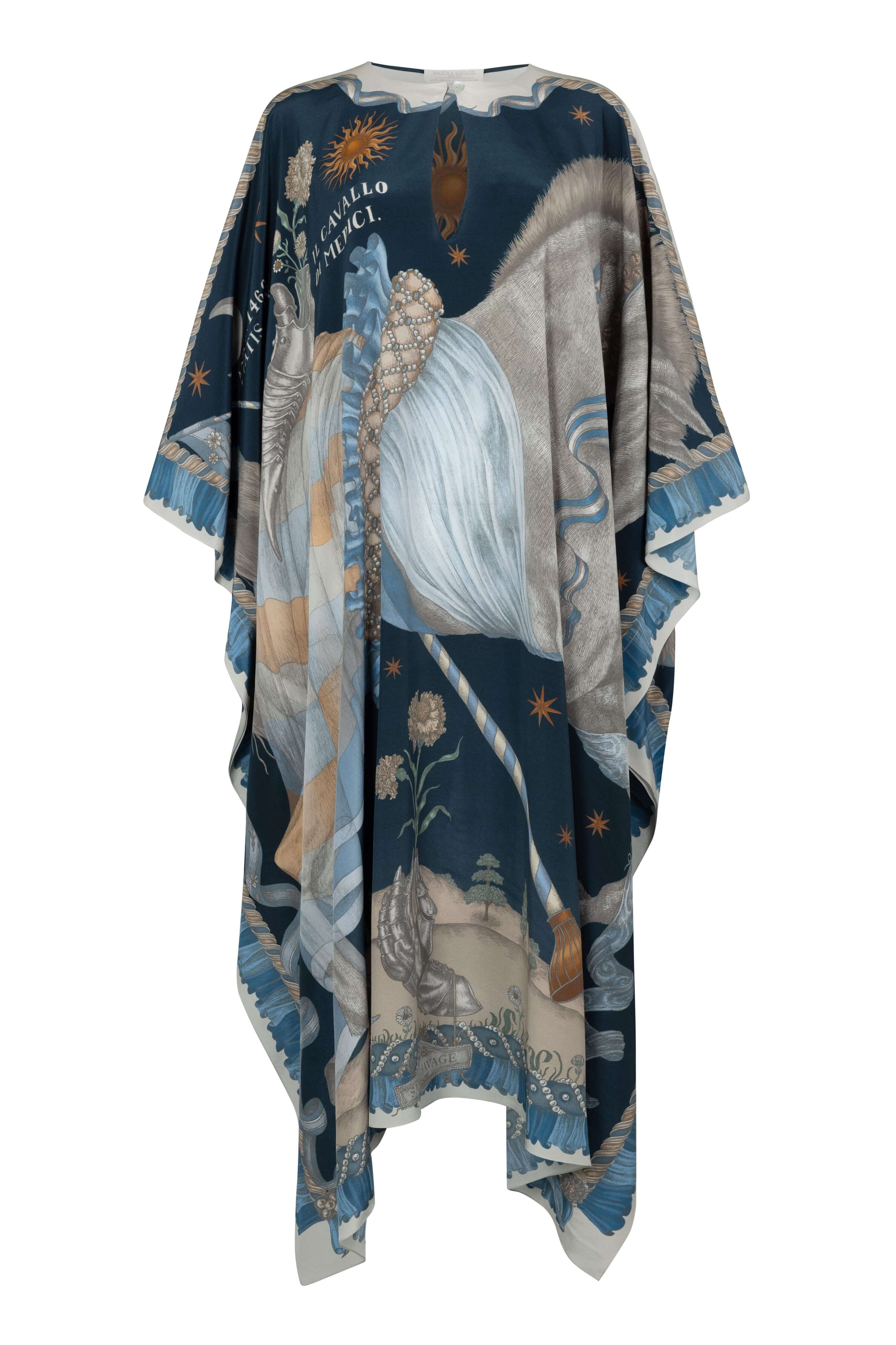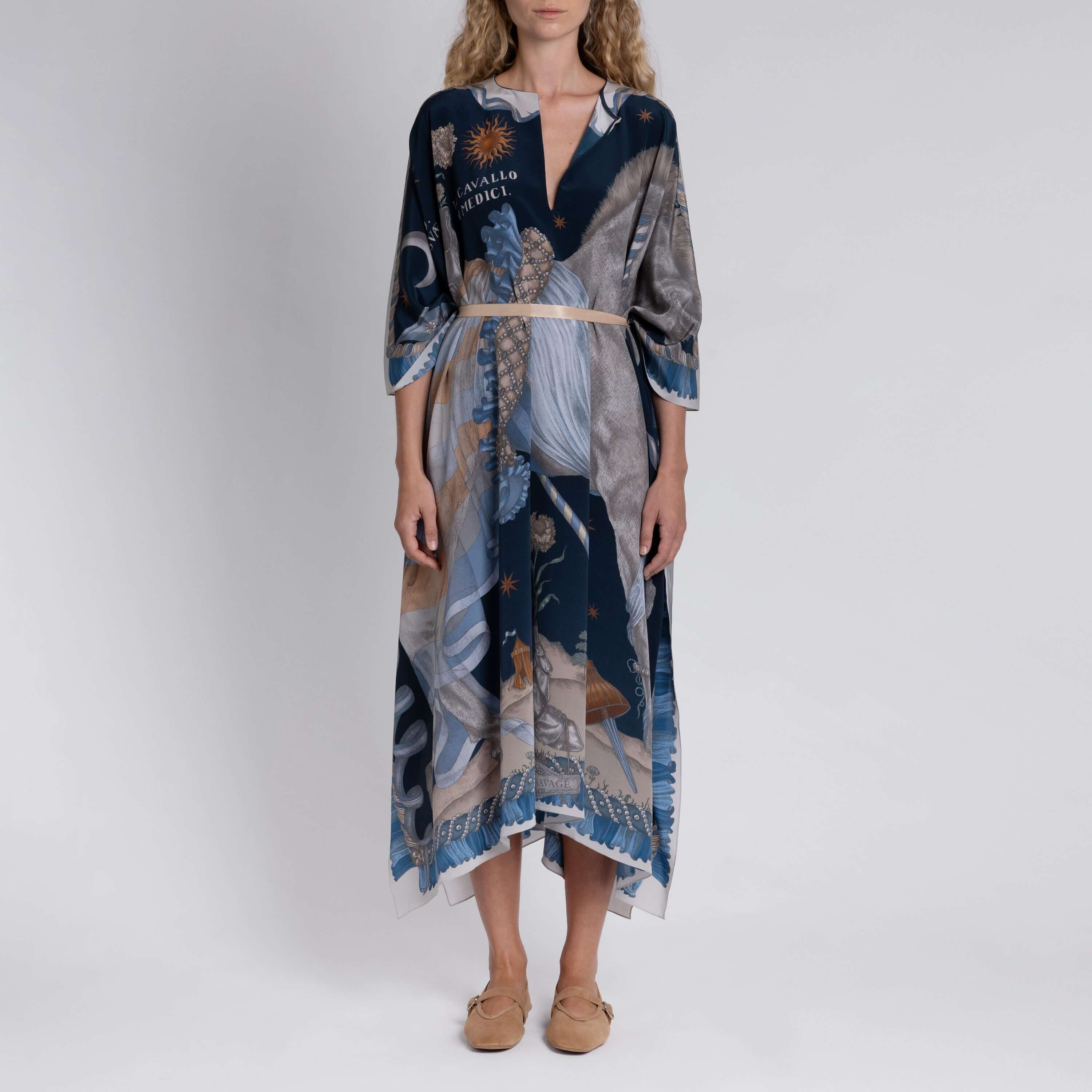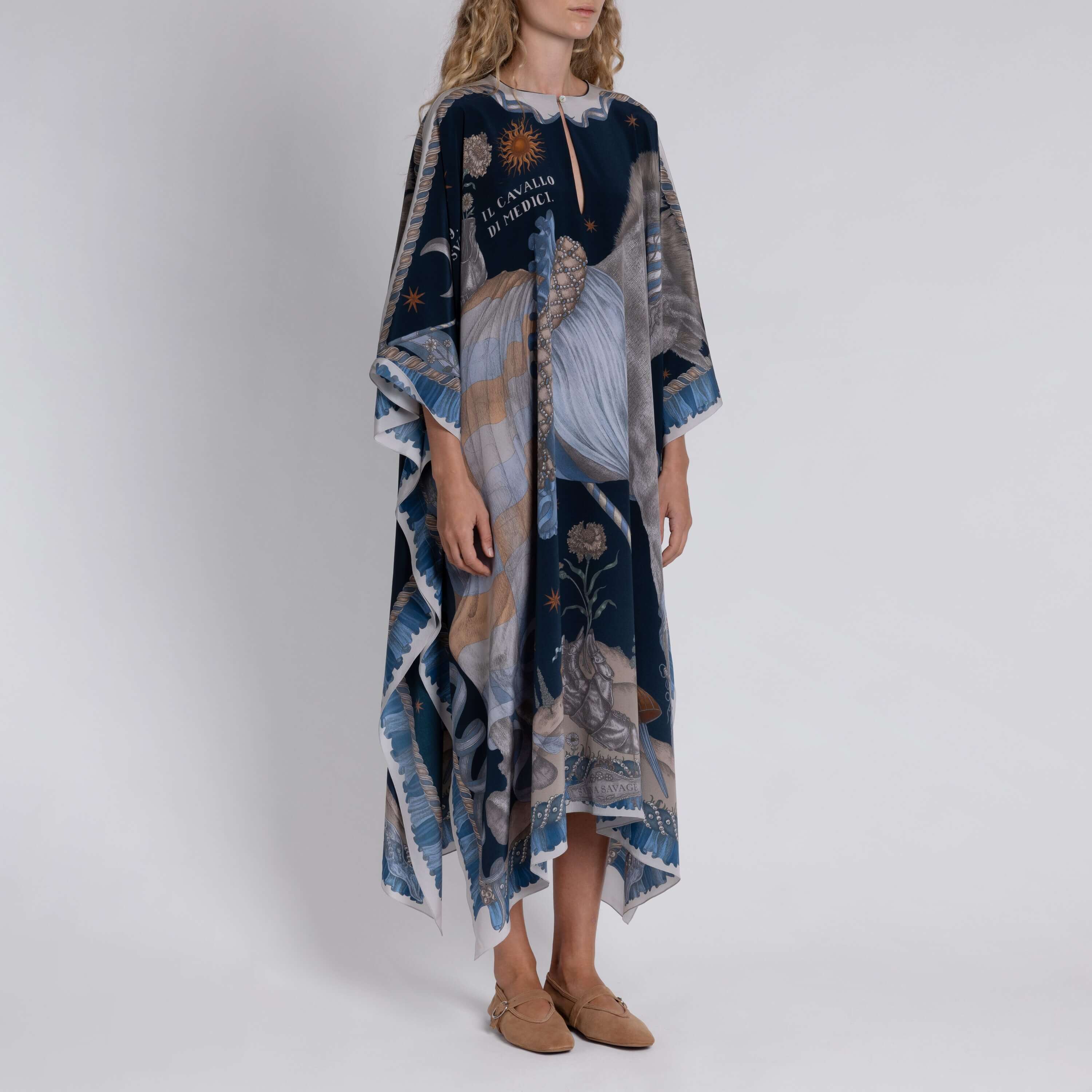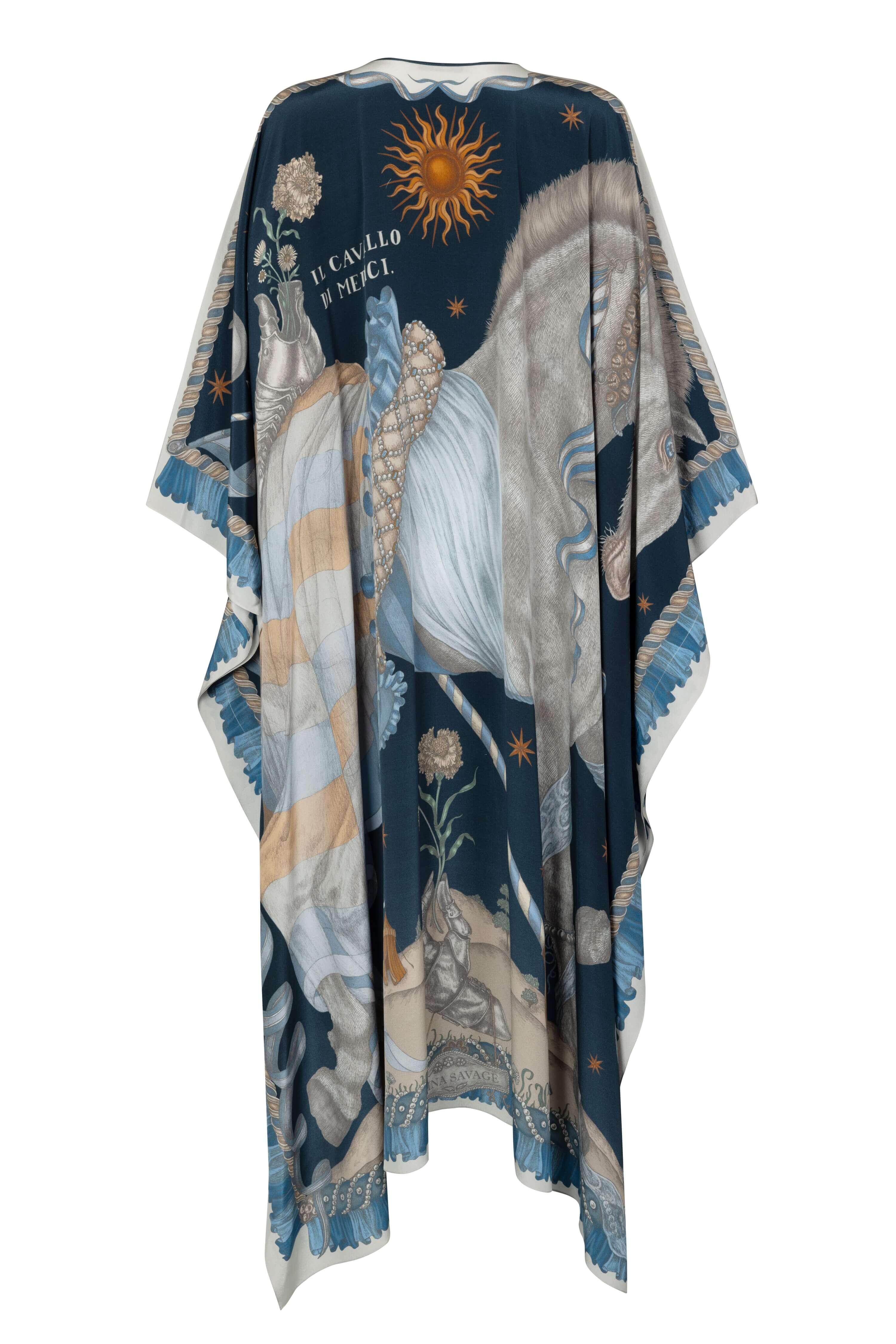 This loose and luxurious Silk Kaftan is made in London from our dusky Crepe-de-Chine, perfectly displaying the exquisitely detailed print. One size fits all in this elegant, draped garment, the cascading fabric creating a showstopping effect, finished with French seams and a delicate pin hem. The side seams are discretely sewn between the wrist and the knee, and there is a single mother-of-pearl button fastening a keyhole neckline. While perfect for relaxed poolside lounging, simply add a belt or waist-tie to create a structured look for the city and beyond.