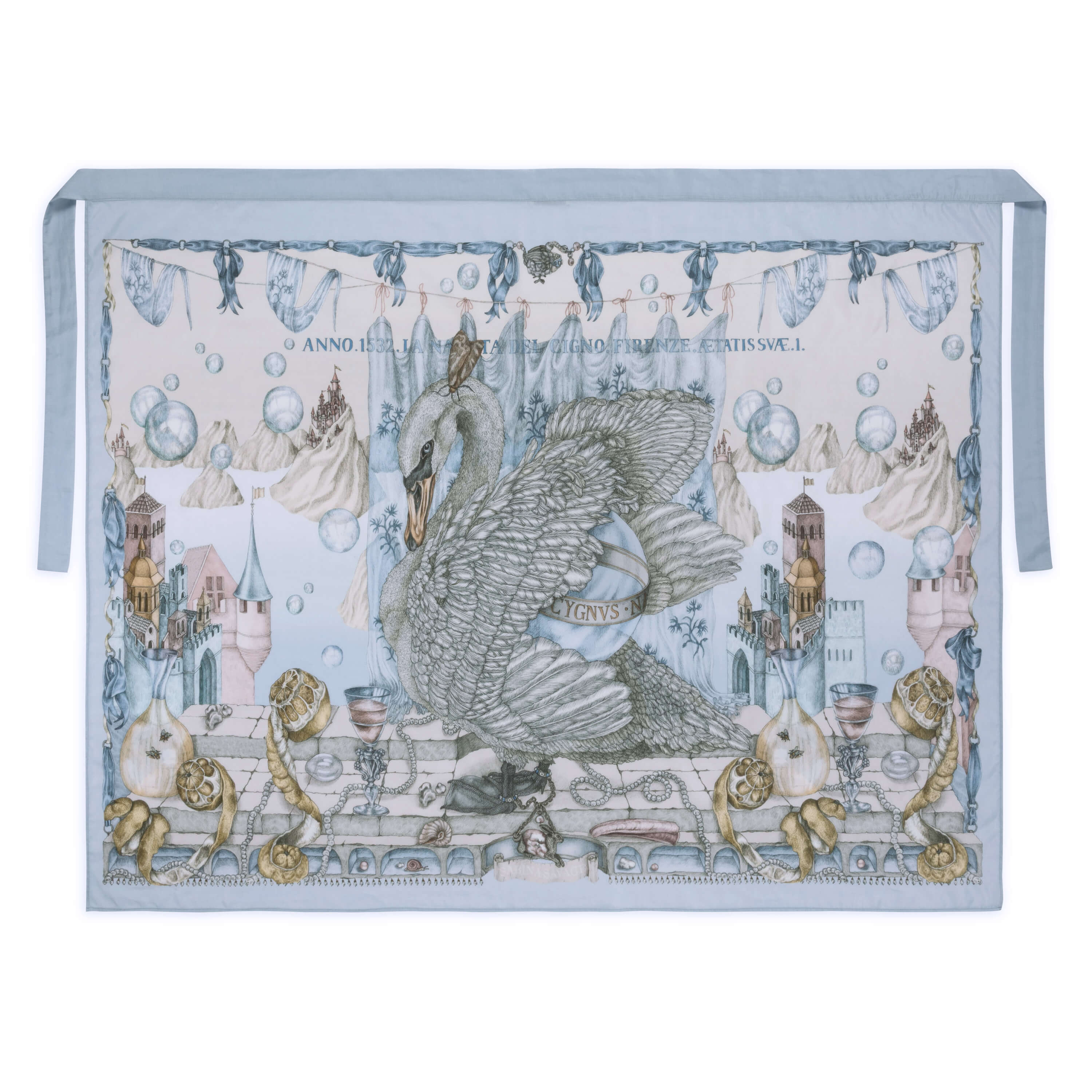 The Glass Swan was inspired by Italian Renaissance paintings and cultural events alongside beliefs and attitudes of the era; the dichotomy of idealism versus naturalism opening a portal to landscapes of fantasy, a ‘New World’. Glass, bubbles and delicate, translucent fabrics were all employed within Italian Renaissance art as a metaphor or philosophical allegory for the immaculate conception, for light passes through these objects without causing harm. In this vein, Botticelli’s Primavera and The Birth of Venus were referenced, in tandem with strings and chains of pearls, denoting purity, preciousness and truth. The immediate scene around the protagonist is a Renaissance still life; again, translucent liquids and glass objects are employed for their symbolism, while citrus (known as ‘medicinal apples’) are abandoned half-peeled. Small creatures, such as wasps and snails, act as symbols of the brevity and impermanence of life. Bordered by a satin ribbon, the scene is laid within a fairytale landscape, where pastel palaces and elegant spires extend into the hazy skies from atop the lofty mountains. This is no ordinary view; it is a place where the immortals tread, the state between earth and heaven.