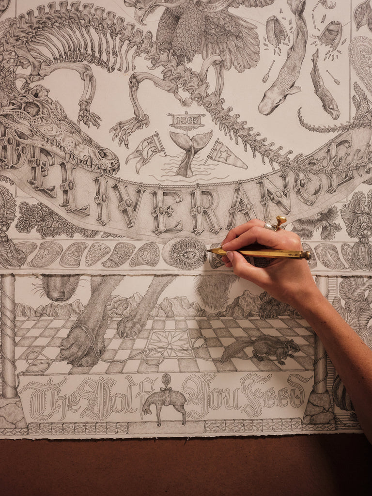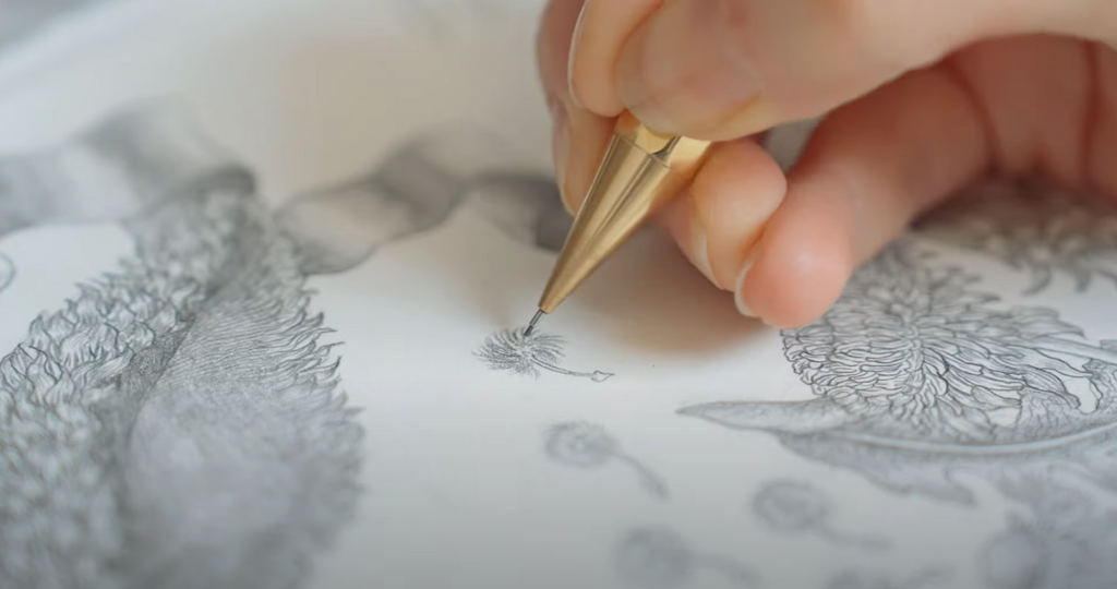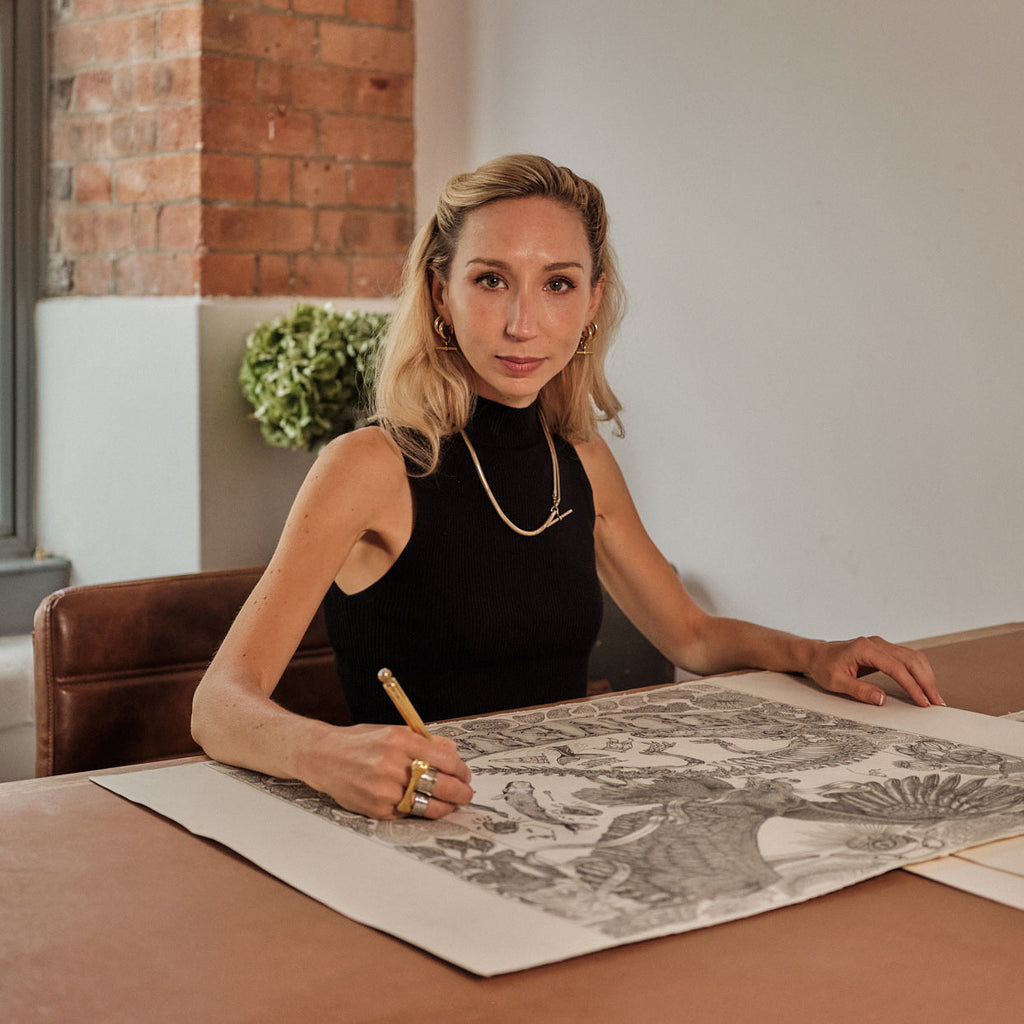 Sabina often listens to audiobooks on her chosen subject while working, fleshing out the story of the collection as she draws. Each pencil illustration takes between four to six weeks to complete, depending on its complexity. The artist likens her experience of the illustration process to an archaeological dig; it is as though the final design already exists beneath the surface of the paper, and her task is to gently and methodically uncover it, without causing damage in the process.