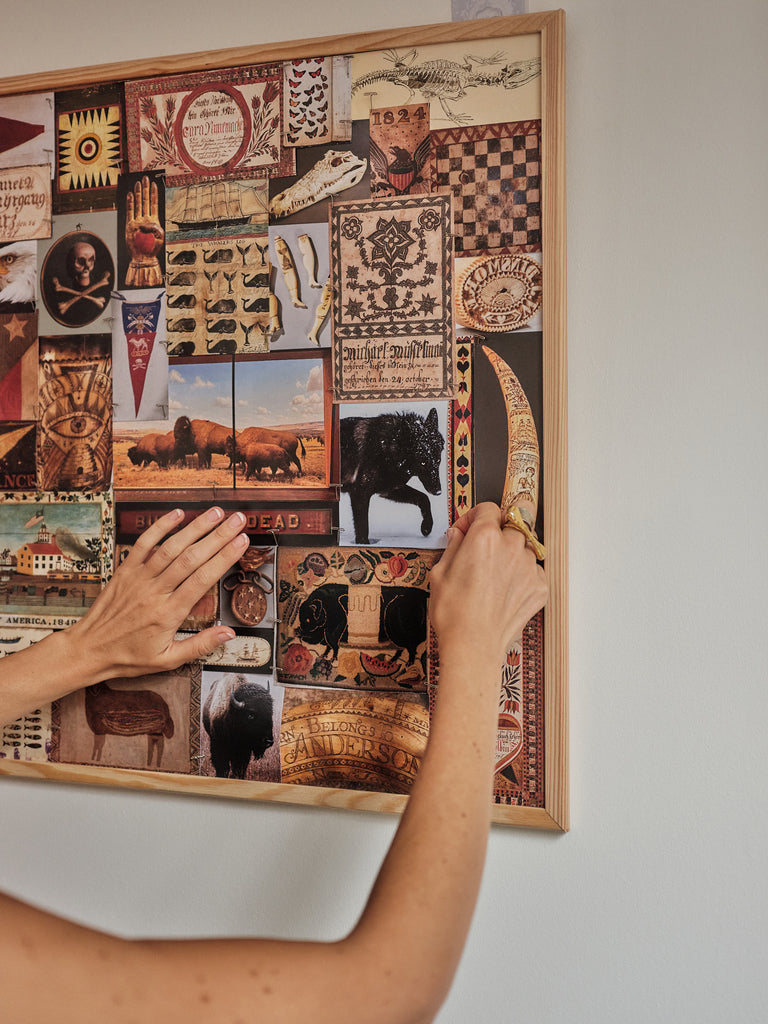 With all study collateral collated, the physical moodboard is next to breathe life into the glowing cinders. As a visual culmination of Sabina’s learnings, it forms a patchwork tapestry of detail and colour, bringing every element of the research together. At this point, the embers combust into a flame, the narrative arc is illuminated and the shape of a collection begins to appear in the smoke.