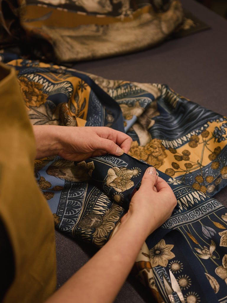 The printed fabrics are handed to a team of highly skilled UK artisans who hand-roll, stitch or hand-fringe the edges of the design, finishing each scarf in its final form.