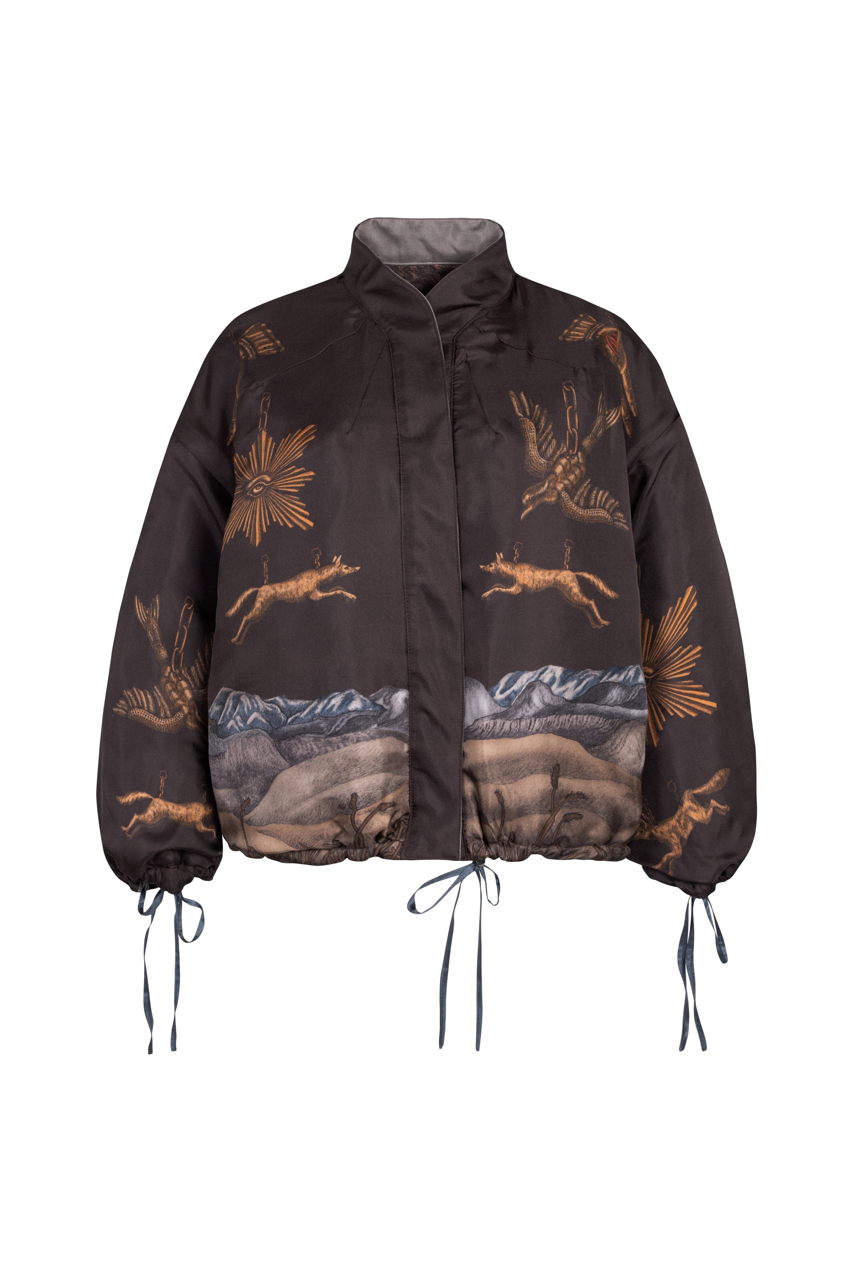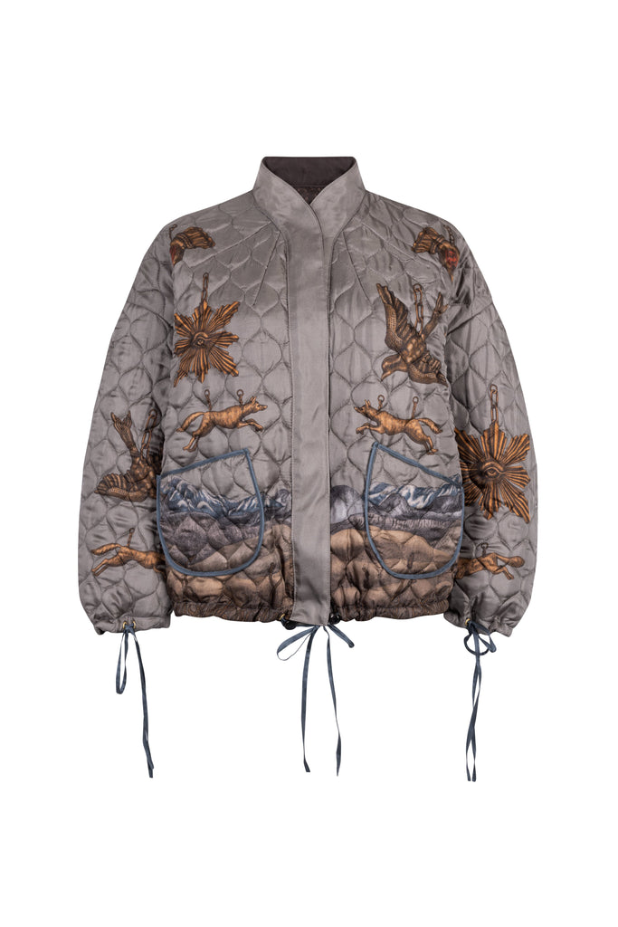 Secrets of the Bison Reversible Silk Bomber Jacket draws inspiration from a wide range of sources. The bison motif was first inspired by the incredible dioramas at the American Museum of Natural History in New York and recognises the commercial decimation of the American Bison from 60 million to just 541 by 1889 in an attempt to subjugate the Native American population. The last bison in Oklahoma county was killed in 1876. The jacket features details inspired by hand-laboured American Folk Art objects such as weathervanes and carved decoys. The design also contains many symbols, signs and flags from fraternal society paraphernalia, which have been re-worked and re-purposed to serve as objects of natural reverence, worship towards the earth, including the Eye of Providence.