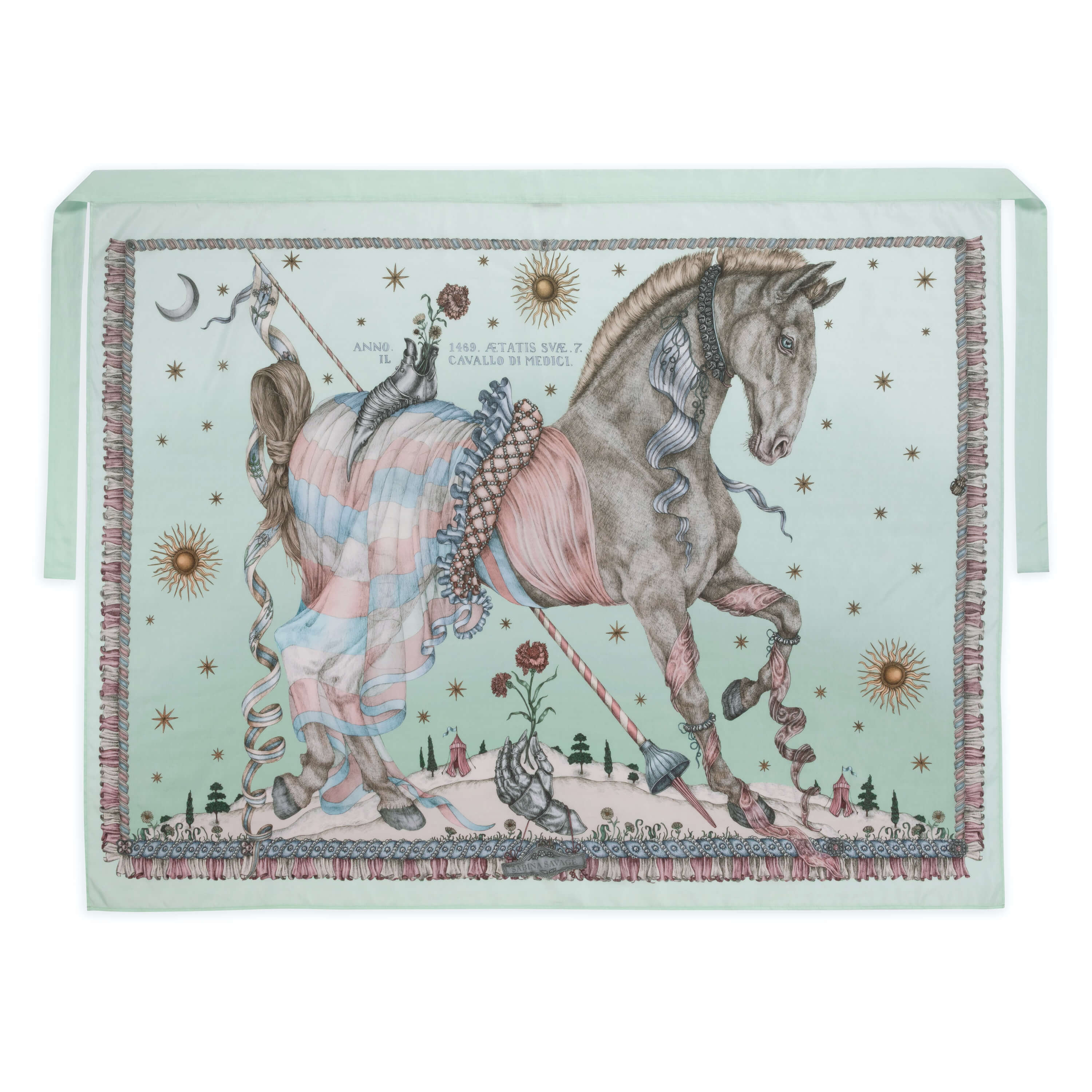 The Celestial Steed was inspired by Italian Renaissance paintings and cultural events alongside beliefs and attitudes of the era; the dichotomy of idealism versus naturalism opening a portal to landscapes of fantasy, a ‘New World’. Inspired by Orso, the unrecognised equestrian star of the famous jousting tournament held by Lorenzo di Medici in 1469, the stark, strong motif of this design was largely influenced by the disarming boldness and architectural simplicity of Antonio Pisanello’s studies of horse heads in his famed Codex Vallardi, alongside equestrian works by Dürer, and various frescoes and masterpieces of the Renaissance era. The armorial elements, such as the sabaton shoe atop the steed’s back, the gauntlet below, and the candy-striped jousting pole all reference historical examples from the Renaissance, while the horse’s striped and embellished carnival attire was inspired by a German illustrated tournament book of the era. The inclusion of sheer fabric is an allusion to Renaissance artwork and symbolism; a juxtaposition of strength and delicacy. Similarly, the metallic armorial elements are holding dainty, fragile flowers; carnations symbolising devotion and divine love, daisies mirroring solar movements throughout day and night; the setting of the sun is inevitably followed by its rising, and there can be no more powerful symbol of hope and resurrection.