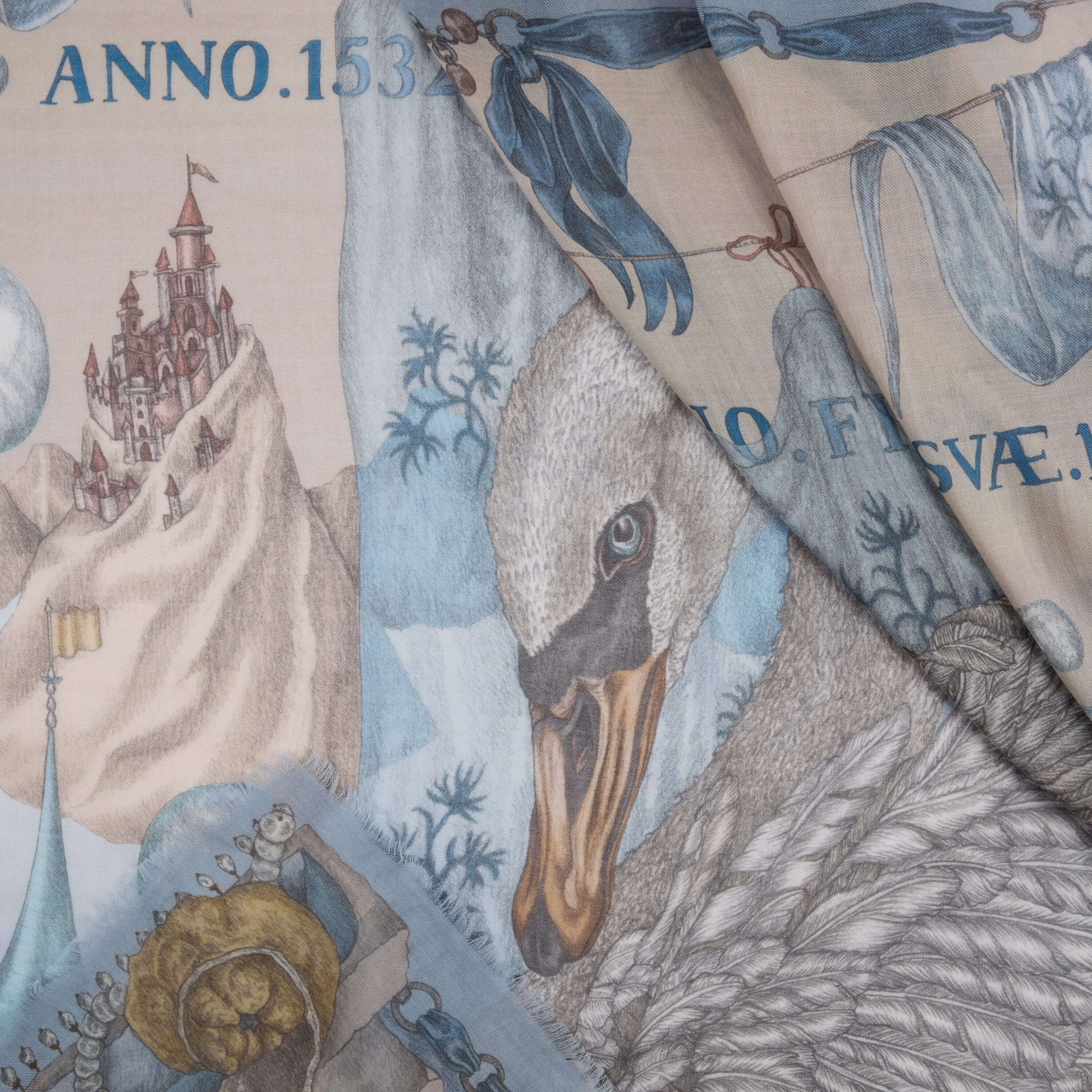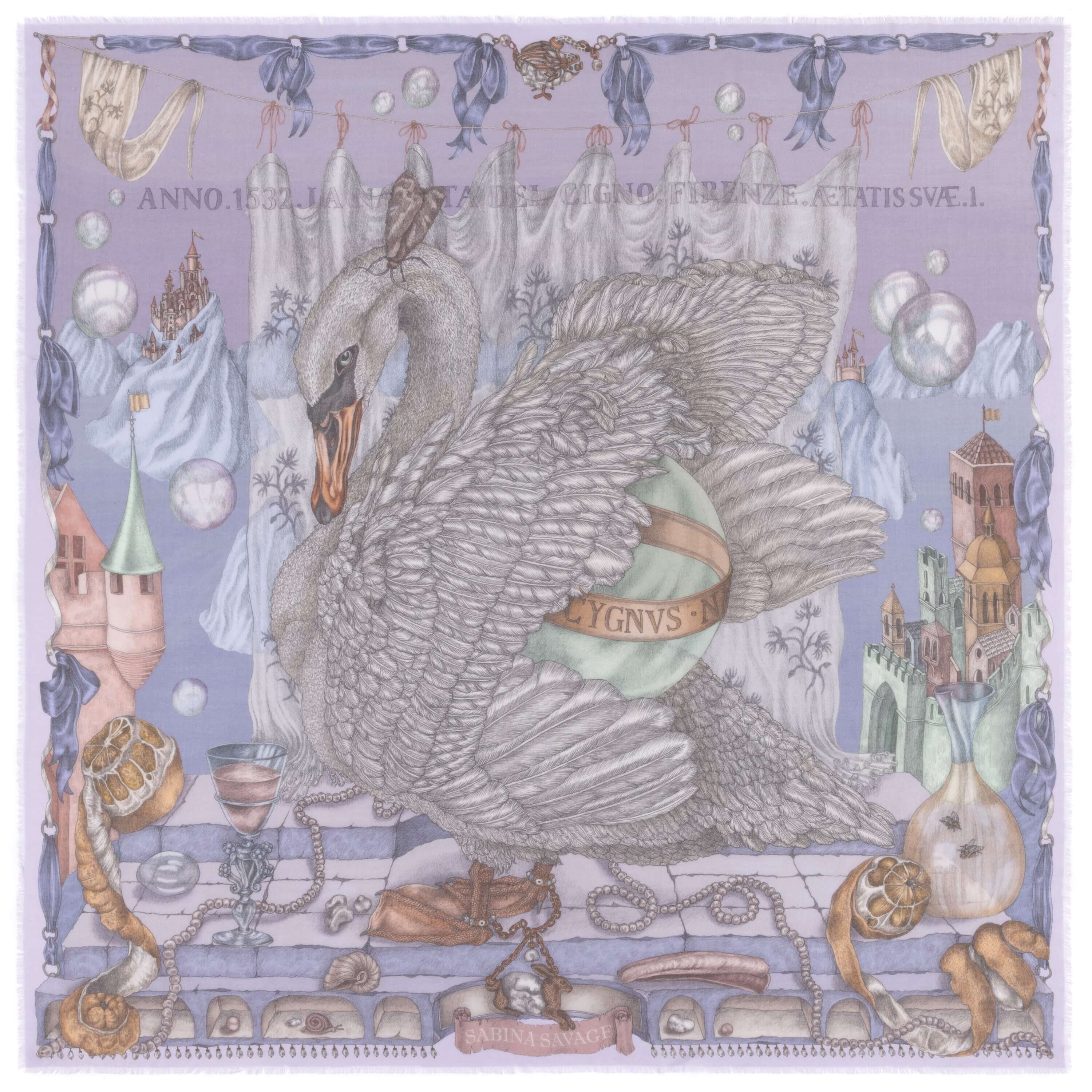 Tranquil in a kaleidoscopic prism of time, The Glass Swan rests in a diffusion of pastel colour. The castle courtyard presents a still life of glinting fruits and glistening glass. Delicate light refracts through filmy bubbles, gossamer flags, glazed orbs and crystalline liquids, piercing yet causing no harm: a symbol of immaculate purity. Glossy, baroque pearls signify preciousness and truth, while crumpled mountains rise from the chalky waters beyond. Tiny insects symbolise nature’s transience.