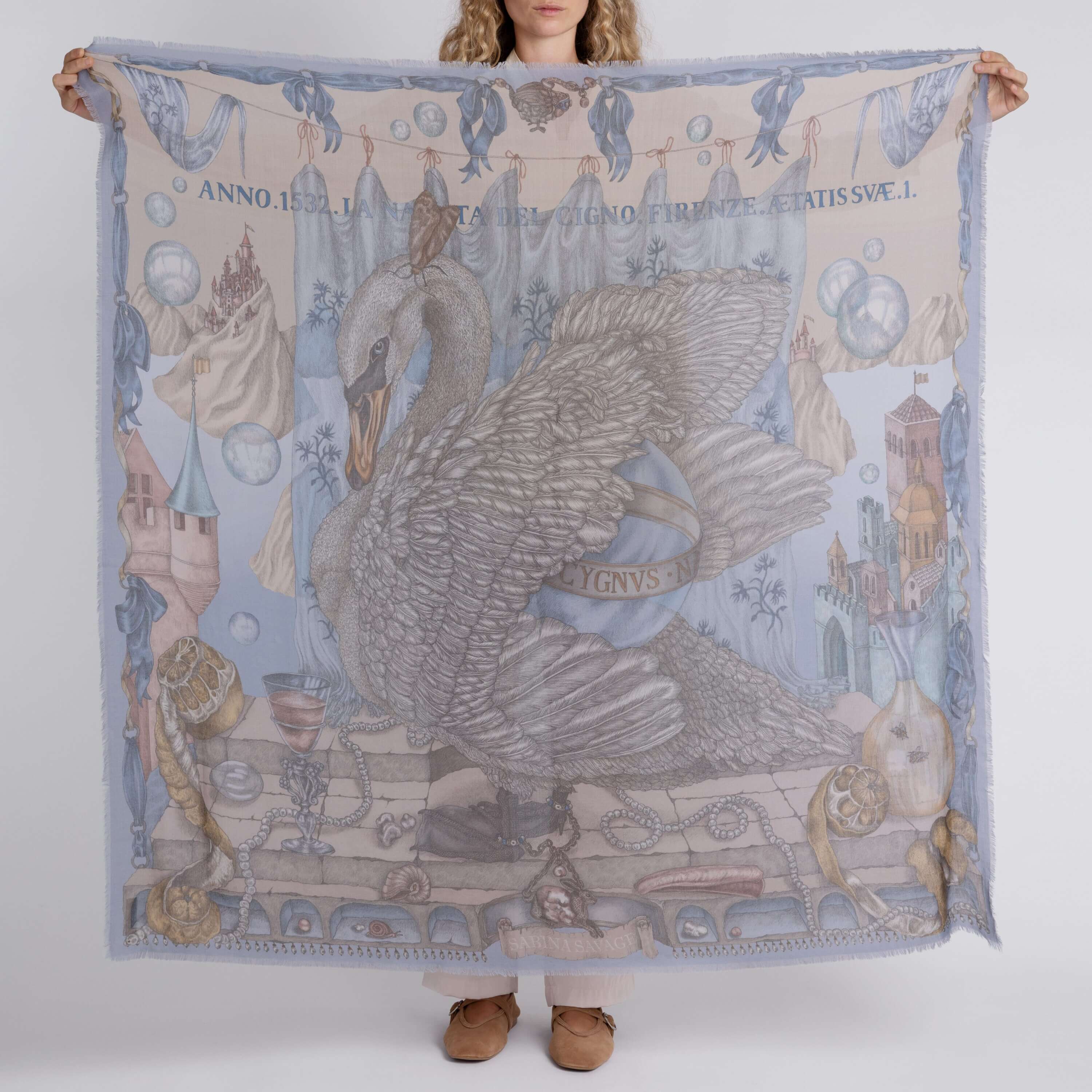 The Glass Swan was inspired by Italian Renaissance paintings and cultural events alongside beliefs and attitudes of the era; the dichotomy of idealism versus naturalism opening a portal to landscapes of fantasy, a ‘New World’. Glass, bubbles and delicate, translucent fabrics were all employed within Italian Renaissance art as a metaphor or philosophical allegory for the immaculate conception, for light passes through these objects without causing harm. In this vein, Botticelli’s Primavera and The Birth of Venus were referenced, in tandem with strings and chains of pearls, denoting purity, preciousness and truth. The immediate scene around the protagonist is a Renaissance still life; again, translucent liquids and glass objects are employed for their symbolism, while citrus (known as ‘medicinal apples’) are abandoned half-peeled. Small creatures, such as wasps and snails, act as symbols of the brevity and impermanence of life. Bordered by a satin ribbon, the scene is laid within a fairytale landscape, where pastel palaces and elegant spires extend into the hazy skies from atop the lofty mountains. This is no ordinary view; it is a place where the immortals tread, the state between earth and heaven.